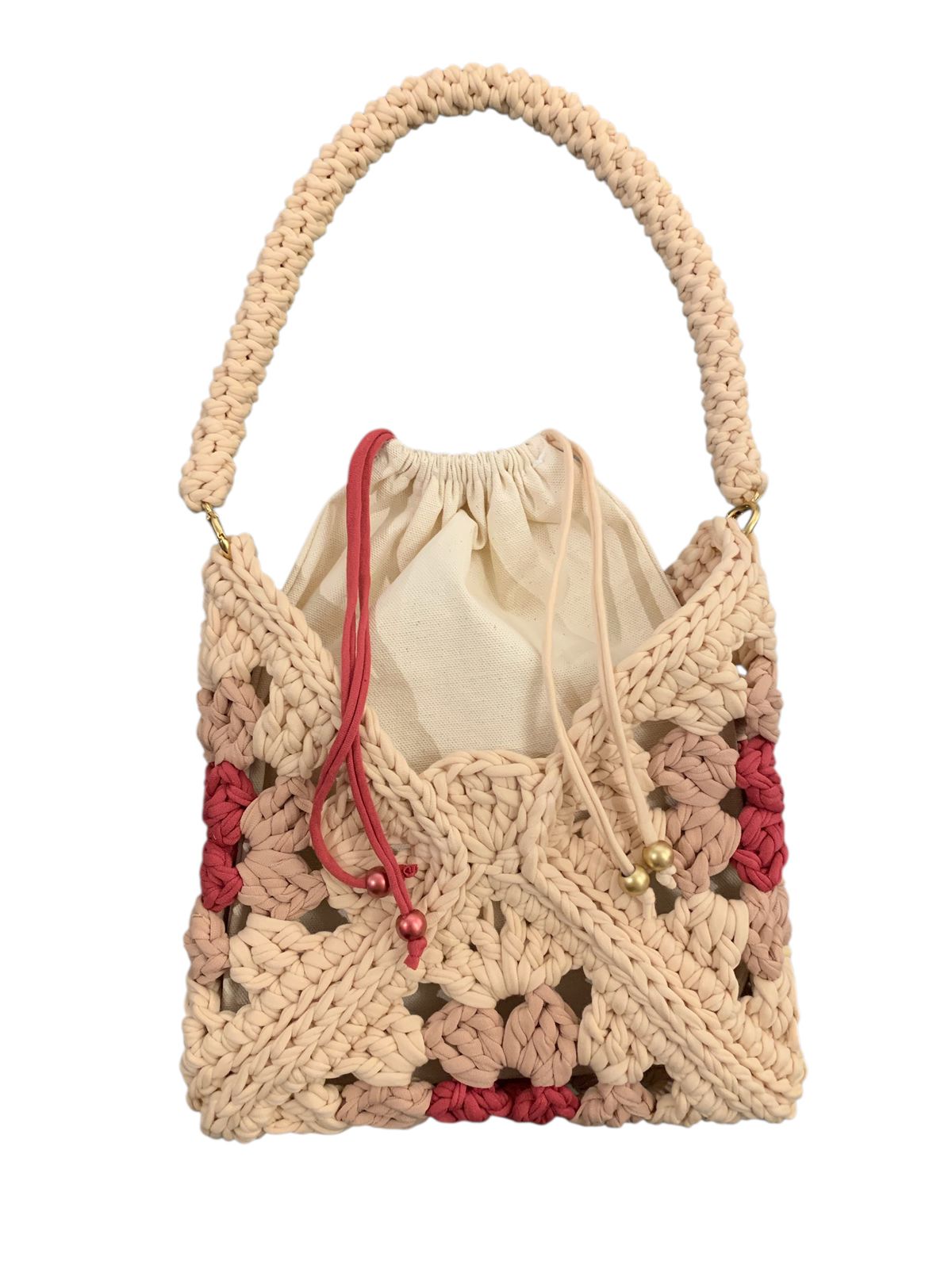 Bolsa confeccionado com fio de malha premium, possui saquinho interno removível e alça em crochê com mosquetão redondo.