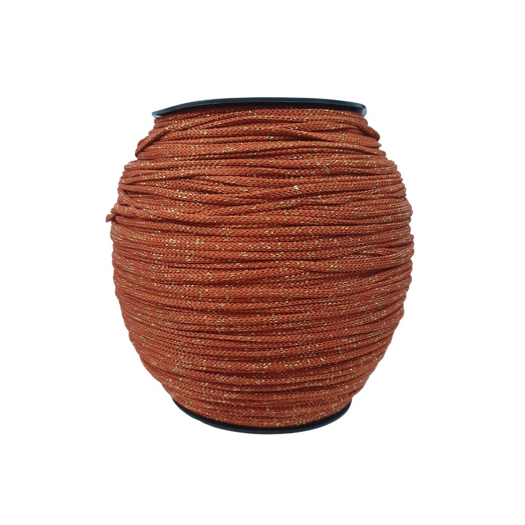 Fio Poliéster com Lurex. Cor: 1187 - Caramelo com Lurex Ouro - Espessura 4mm - Rendimento 340mts.